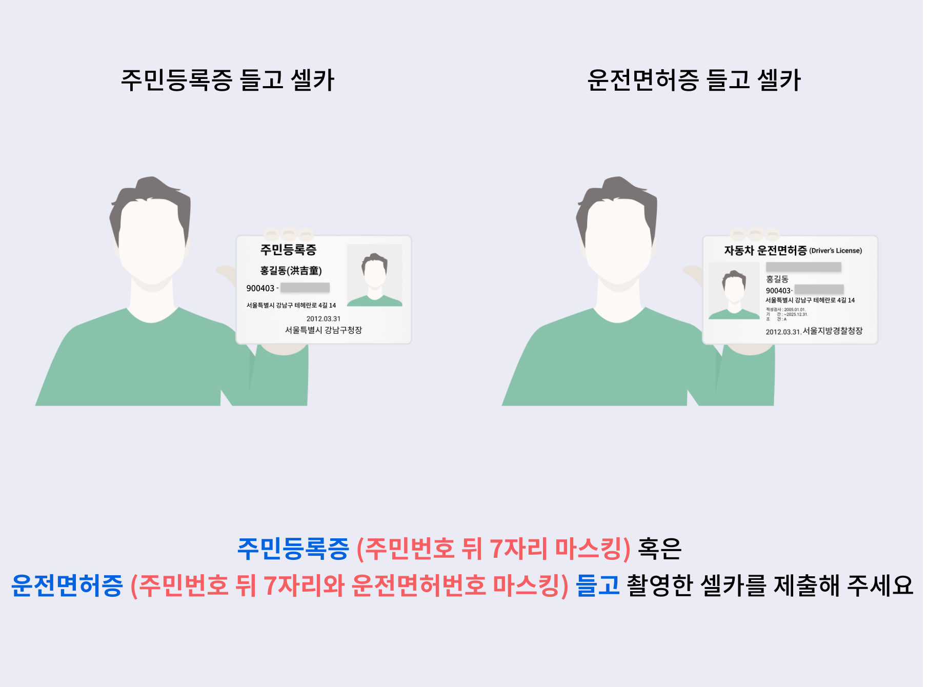 송금인의 유효한 신분증(주민등록증 또는 운전면허증 원본)을 촬영하여 제출합니다. 이름과 생년월일만 노출되도록 마스킹 처리해야 하며, 주민등록번호 뒤 7자리와 운전면허번호는 반드시 가려야 정상 접수됩니다. 스캔본이나 복사본은 인정되지 않고 반드시 촬영본으로 제출해야 합니다.