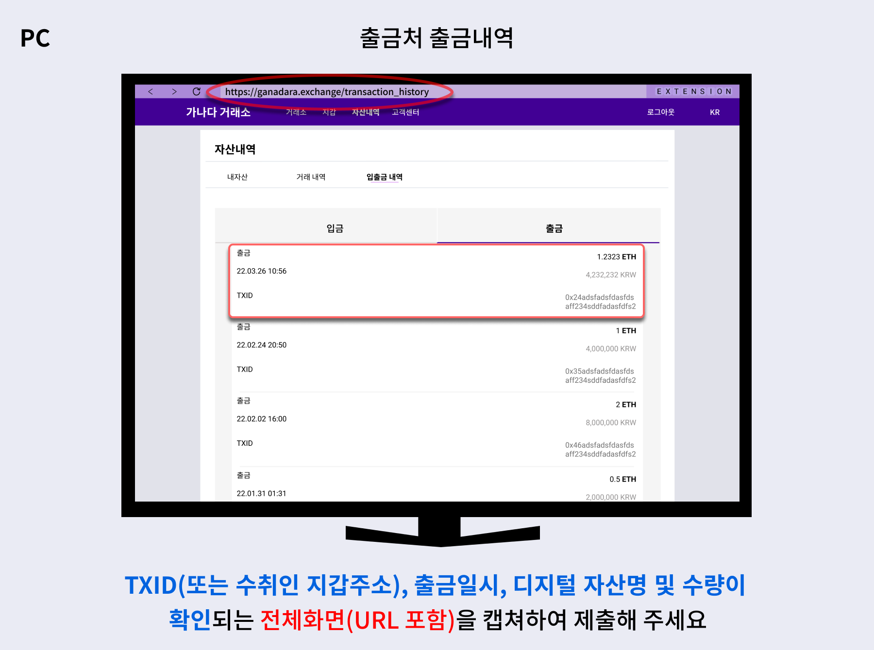 암호화폐를 송금했던 거래소 또는 개인지갑에서 해당 출금 내역 화면을 캡처하여 제출합니다. 캡처 이미지에는 송금 일시, 송금 디지털 자산명 및 수량, 그리고 TXID (또는 수취인 지갑 주소)가 명확하게 확인되어야 합니다. 블록체인 조회 사이트 화면은 인정되지 않습니다. 이는 실제 해당 지갑에서 출금 거래가 발생했음을 증명하는 자료입니다.