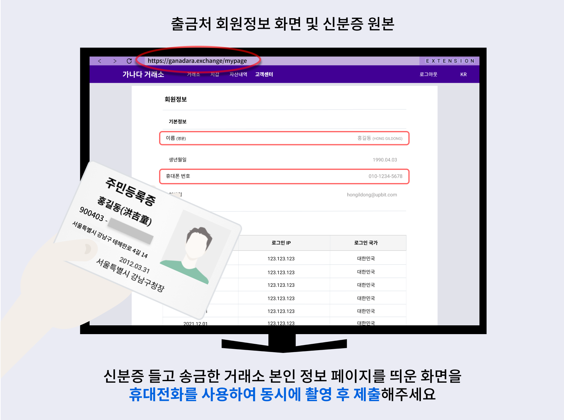 - 개인 지갑에서 출금한 경우: 지갑 주소가 명확히 노출된 개인지갑 화면과 신분증 원본을 동시에 촬영한 이미지를 제출합니다. 신분증은 이름과 생년월일만 노출합니다. 이는 송금인이 해당 지갑 주소의 실제 소유자임을 증명하기 위함입니다.