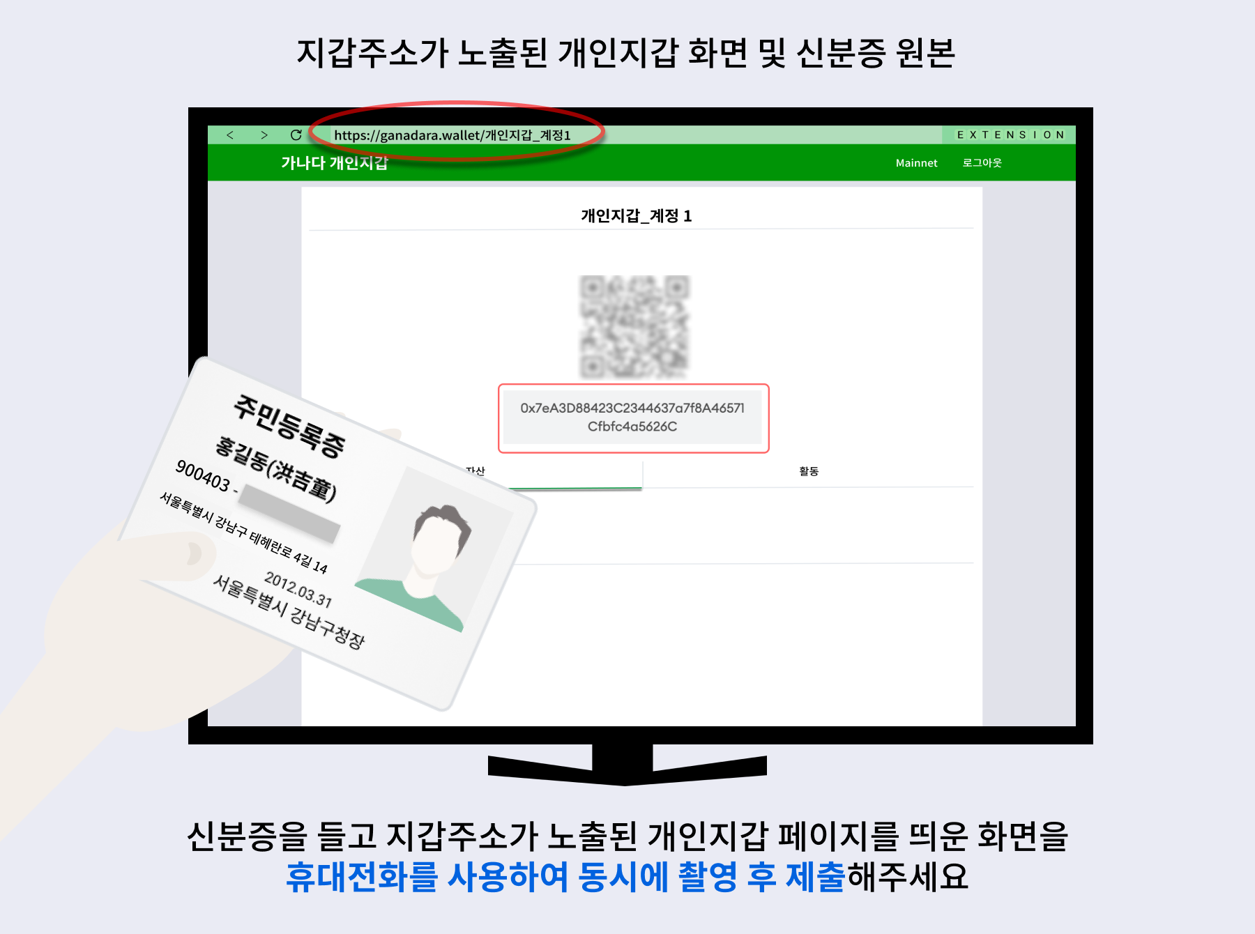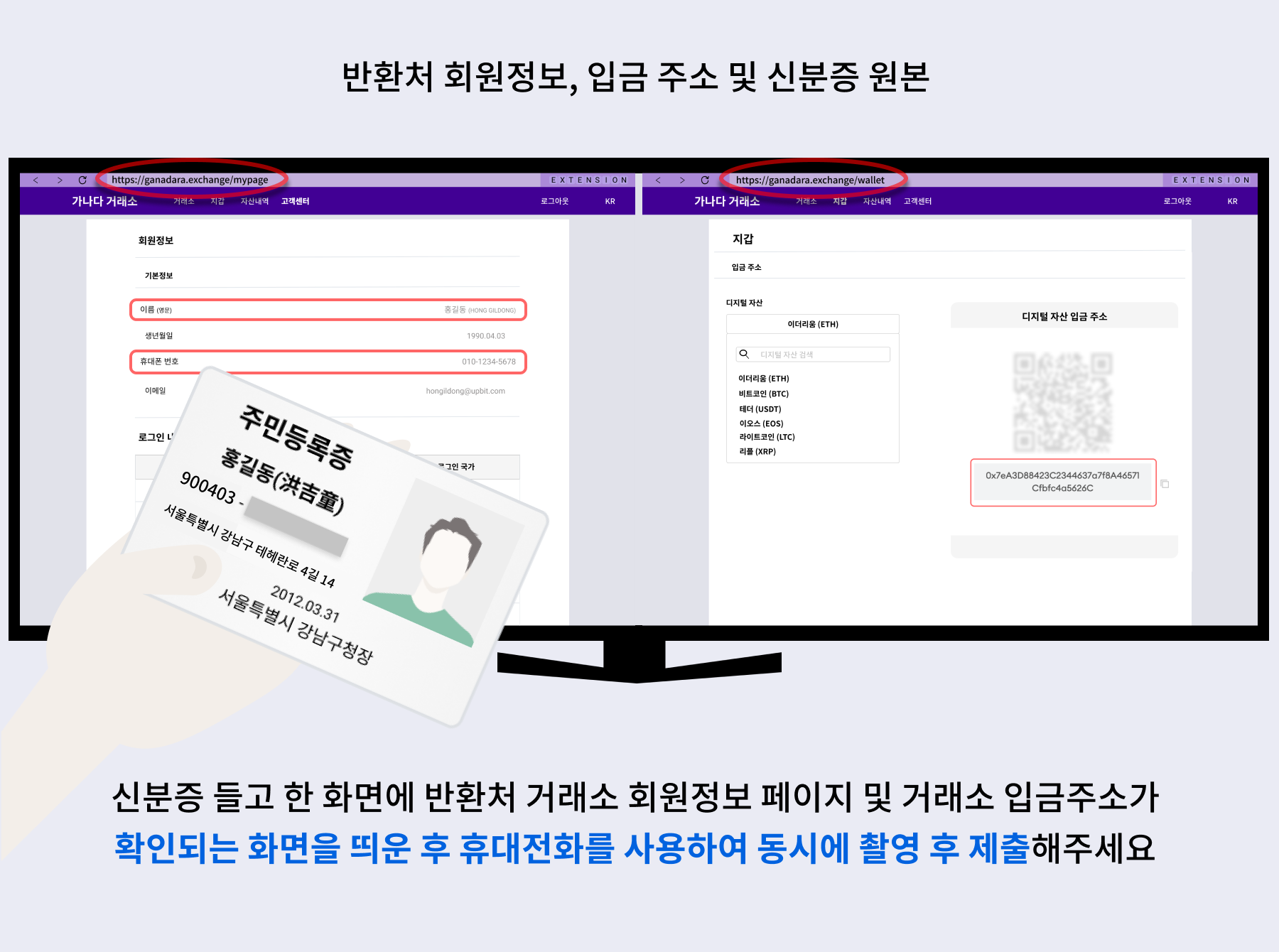 - 개인 지갑일 경우: 지갑 주소가 명확히 노출된 개인지갑 화면과 신분증 원본을 동시에 촬영한 이미지를 제출합니다. 신분증은 이름과 생년월일만 노출합니다. 이는 반환받는 지갑 주소의 실제 소유자가 송금인 본인임을 증명하기 위함입니다.